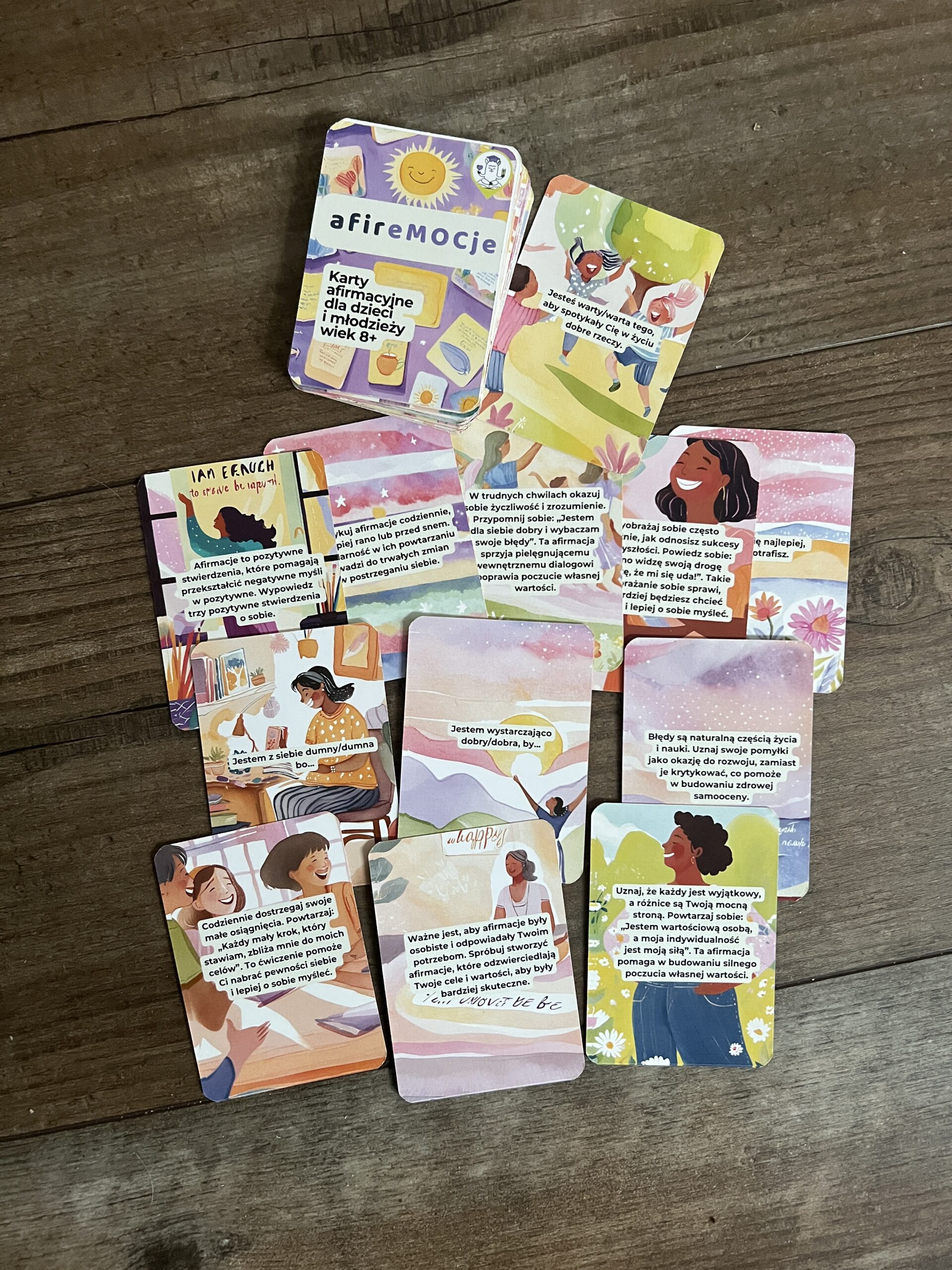 Zestaw 46 kart z afirmacjami i ilustracjami dla dzieci i młodzieży. Na kartach znajdziesz uniwersalne zdania afirmacyjne, budujące wiarę w siebie i poczucie sprawczości.