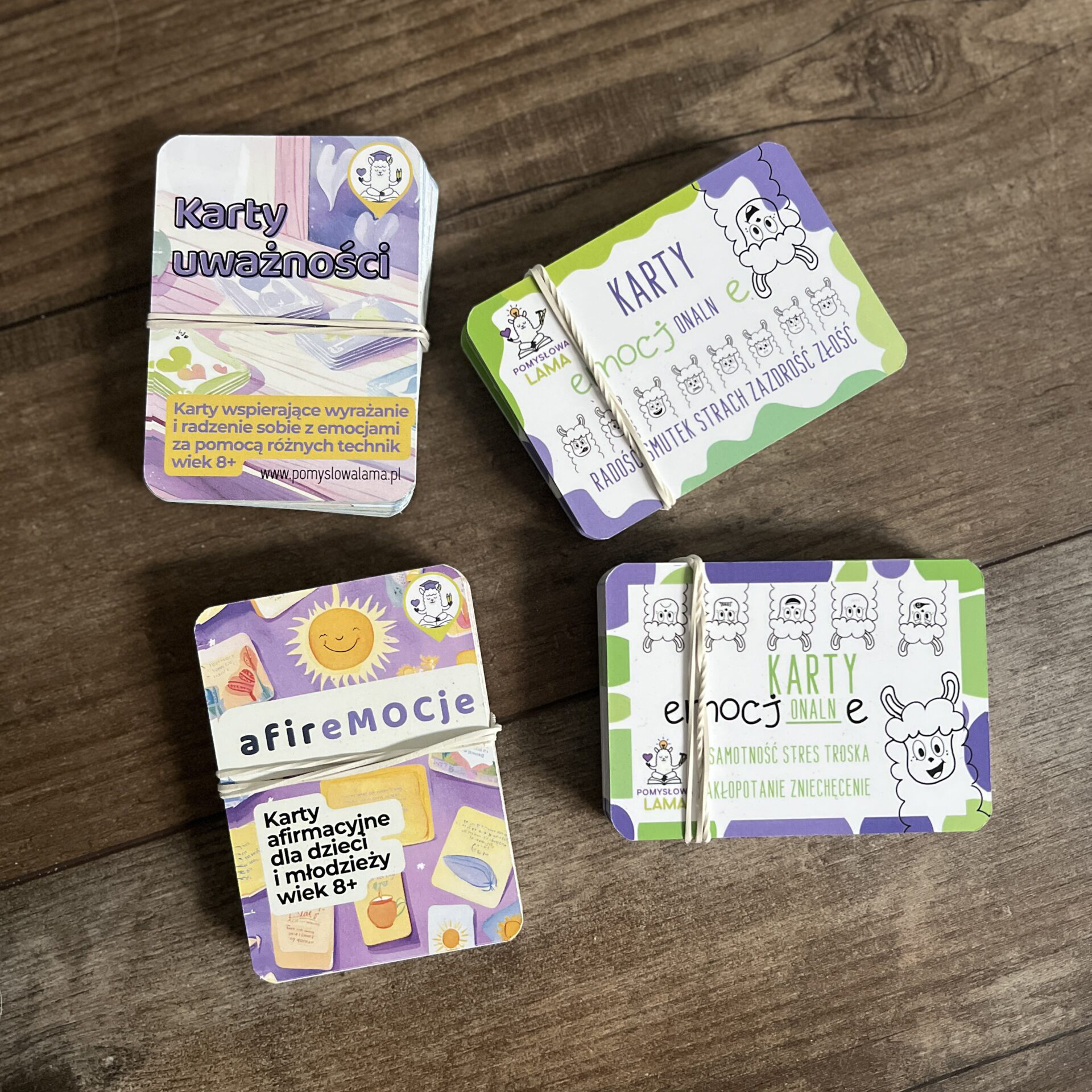 - Karty Emocjonalne – Samotność Stres Troska Zakłopotanie Zniechęcenie – Zestaw 44 kart z pytaniami i zadaniami wspierającymi dzieci w zrozumieniu, nazywaniu i akceptacji emocji. Każda emocja posiada swój unikalny zestaw kart. Więcej o tej talii przeczytasz TUTAJ.